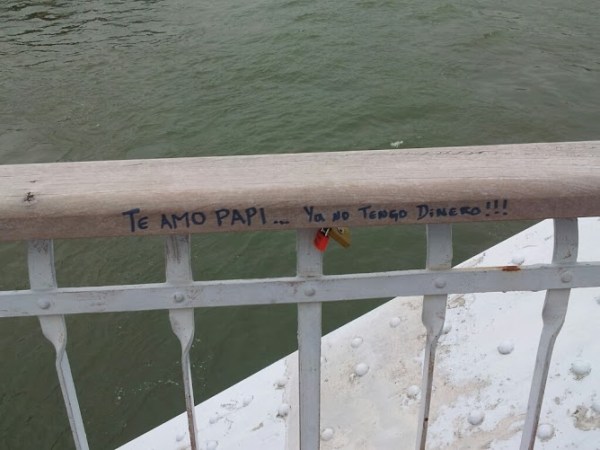 Después de tomar varias fotos nos fuimos hacia la Torre Eiffel… caminando. El trayecto no es muy largo, pero el día no estaba muy bello y la humedad se hacía sentir… y mi pie no estaba contento. Después de algunas paradas llegamos a un puente cerca de la Torre Eiffel que se quería parecer al puente de los candados (que ya se los mostraré) En este puente nos encontramos algunas cosas curiosas…
