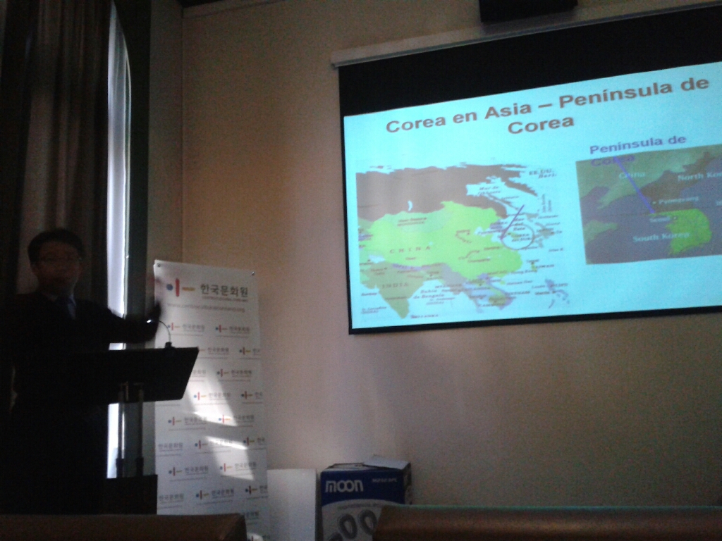 Nos recibieron muy amablemente en el Centro Cultural, en la sala de Medios Audiovisuales donde se efectuó la charla. La misma fue dada por el Director del Centro Cultural Coreano, Yi Chongyul, quien nos contó dónde está ubicada Corea, la diferencia entre Corea del Norte y Corea del Sur, sobre su historia, su bandera, su idioma, la escritura hangul, la vestimenta, comida, y sobre el milagro del río Han, como un pueblo en 50 años logró levantarse de la miseria y transformarse en una de las potencias mundiales.