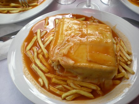 Para almorzar, tuve el placer de degustar la francesinha, ¡algo que ahora recién recuperada de gastroenteritis sería imposible de probar! Es como un sándwich con un montón de variedades de fiambres, bañado en queso y una salsa riquísima, y viene con papas fritas. Una bomba al estómago pero un placer para los sentidos.